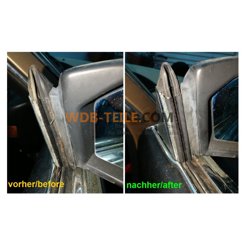 Zestaw uszczelek pionowych (2x prowadnice FE) po stronie kierowcy i pasażera (lewej i prawej) do Mercedesa-Benz W123 Coupé CE/CD. Są to reprodukcje prowadnic umieszczonych bezpośrednio na lusterku zewnętrznym.