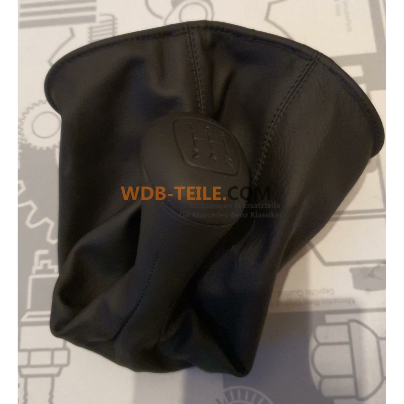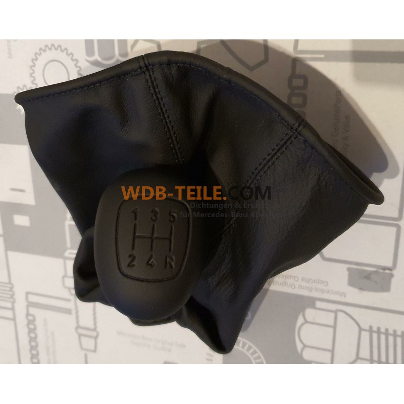 Oryginalna klamka/gałka zmiany biegów Mercedes 5-biegowa, obszyta skórą, w komplecie z osłoną zmiany biegów.