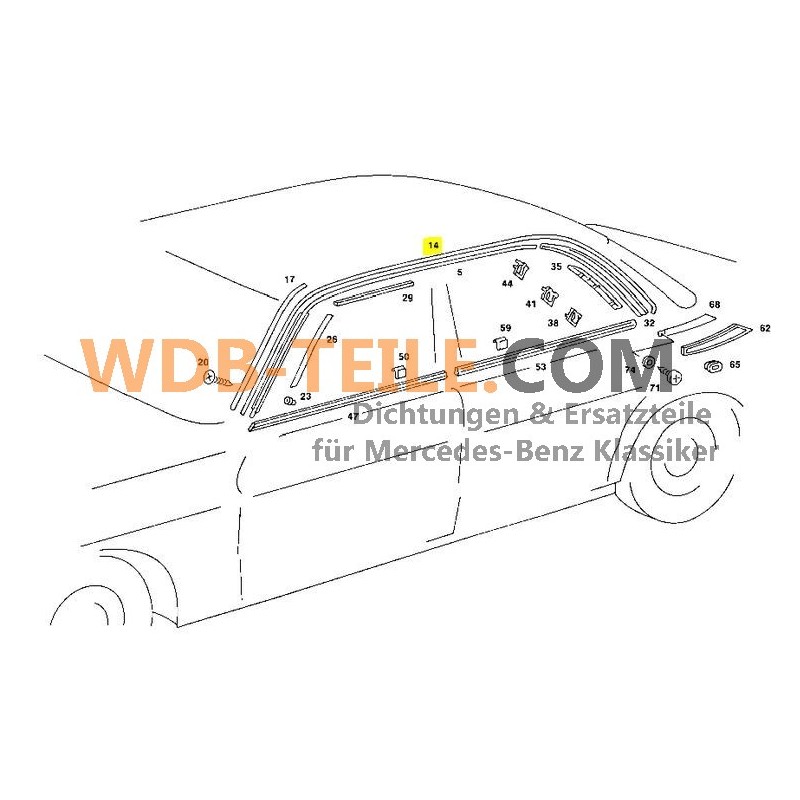 Set (2 bucăți) capac/profil de cauciuc pentru bandă de ploaie ( 4 metri într-o singură bucată) . De la stâlpul peretelui din față la stâlpul din spate. Poate fi folosit pentru partea soferului si pasagerului. Bara de ploaie este puțin mai lungă decât cea originală și trebuie scurtată în timpul instalării.