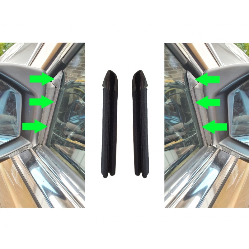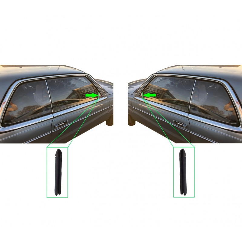Mercedes-Benz W123 Coupé CE/CD'nin sürücü ve yolcu tarafı (sol ve sağ) için dikey conta seti (2x FE kılavuz rayı). Bunlar, doğrudan dış aynanın üzerinde bulunan kılavuz rayının kopyalarıdır.
